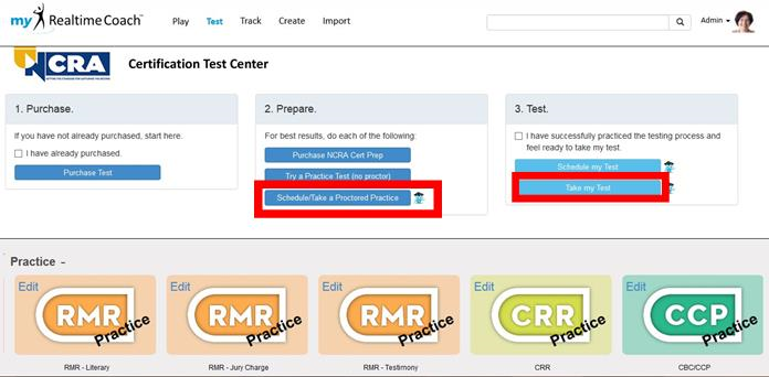 On the day of your test, click Take my Test. (For a practice test, click Schedule/Take a Proctored Practice)